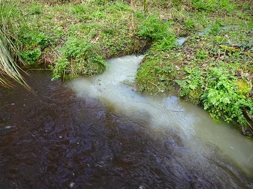 Nous avons toutes les deux relevés que l'étude d'impacts de la carrière, notamment de son approfondissement, sur le fonctionnement hydrologique et hydro-géologique des masses d'eau souterraines et des cours d'eau ne répond pas à la question de l'évaluation de ses impacts ! Ceci est très gênant...d'autant plus que les pêcheurs ont observé par le passé des rejets d'eau d'exhaure de la carrière dans le ruisseau. La photo ci-après en témoigne.