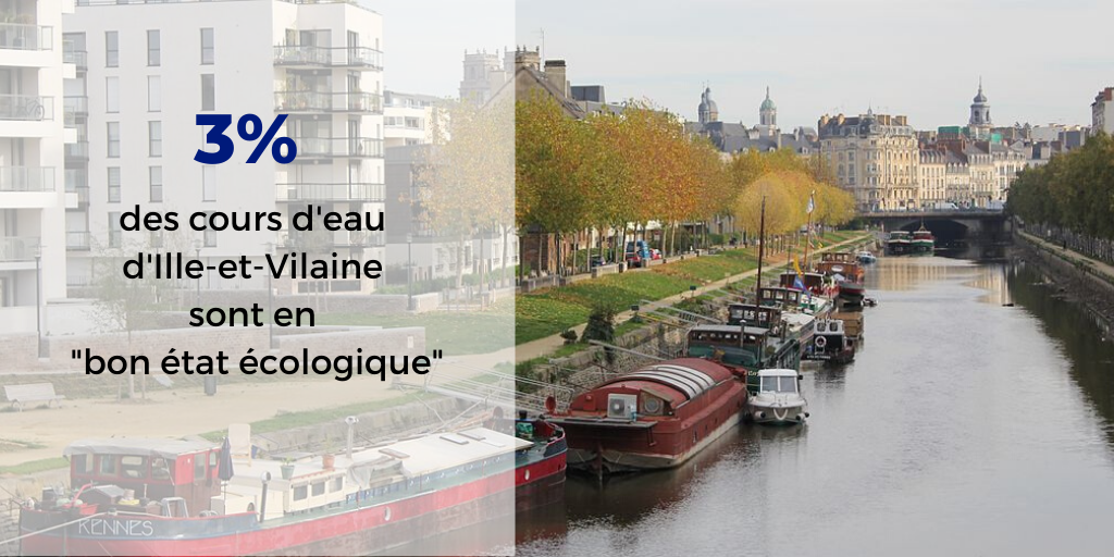 L’échéance de 2027 approche, et après plus de 10 ans de mise en œuvre des différents SDAGE français, et malgré les dizaines de milliards d’euros investis par les agences de l’eau, le résultat reste très mitigé. En 2019, seulement 45 % des cours d’eau français sont en bon état ; ce chiffre est de 33 % pour la Bretagne et tombe à 3 % en Ille-et-Vilaine !