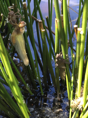 Et notre libellule n’est pas toute seule ! Elle partage en effet la touffe de jonc avec deux autres congénères occupées, elles aussi, à revêtir leur belle robe d’adulte. Trois libellules, à des stades différents de métamorphoses, sur le même buisson de jonc : la belle surprise !